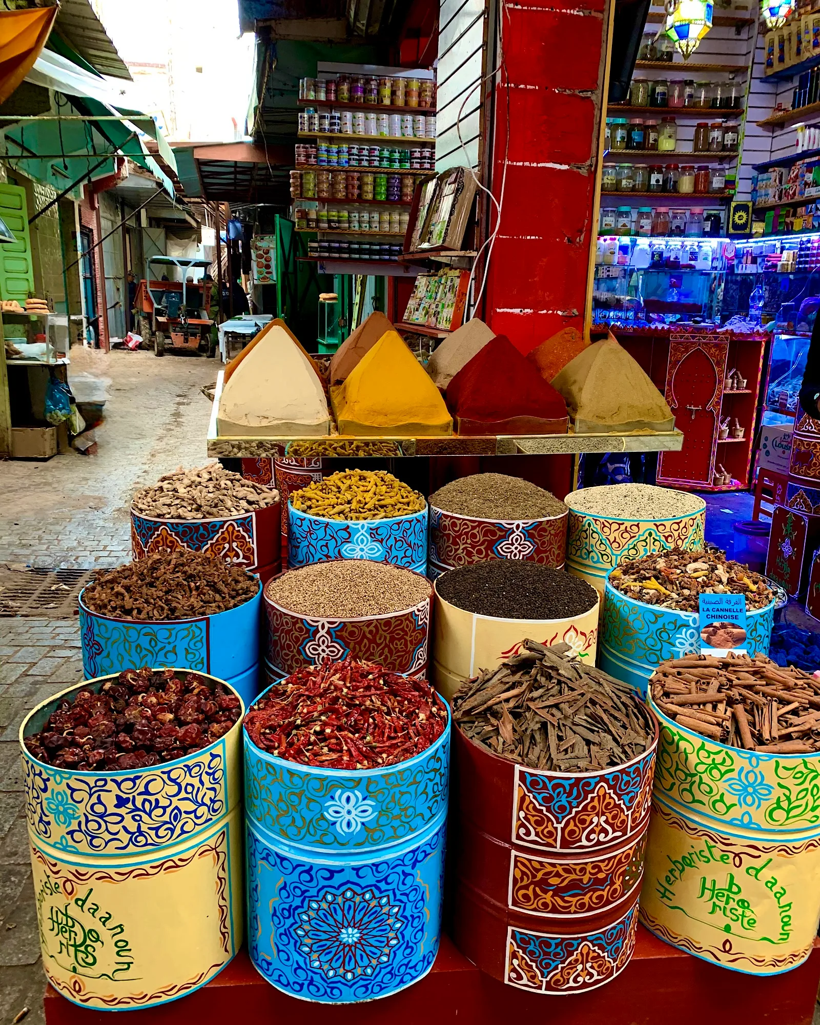 Marrakesch, die „Rote Stadt“ – ein Rausch aus Farben, Düften und 1001 Nacht – ist ein Erlebnis für alle Sinne. Es ist laut, bunt und manchmal chaotisch, aber gleichzeitig voller versteckter Ruheoasen. Wir haben im Riad M’Boja (“Chez Ali Baba”) übernachtet und können es euch nur ans Herz legen: Ein wunderschöner, traditioneller Ruhepol mit detailverliebtem Design direkt in der wuseligen Medina. Das Frühstück und Abendessen im Innenhof war der perfekte Start und Abschluss für unsere Tage.