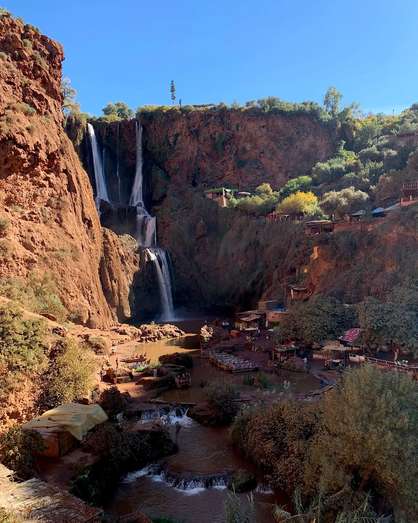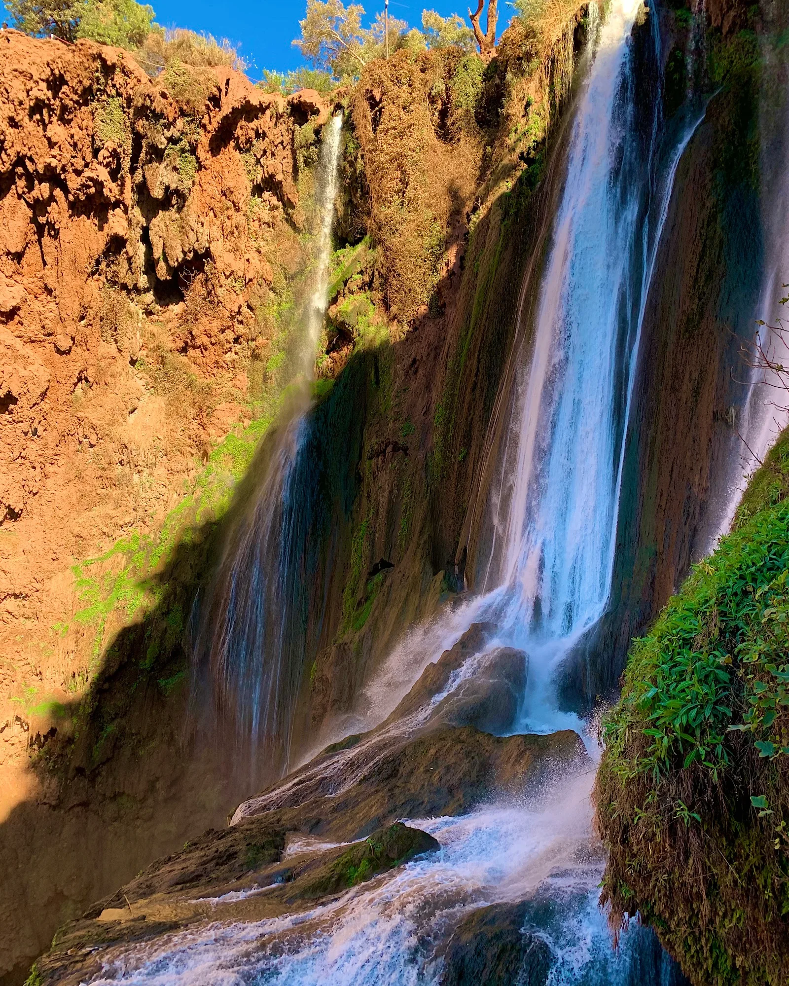 Die Wasserfälle sind eine wahre grüne Oase inmitten der staubigen, roten Felslandschaft. Mit einer Fallhöhe von etwa 110 Metern stürzt das Wasser über drei Stufen in die Tiefe – ein Anblick, der in Marokko seinesgleichen sucht.